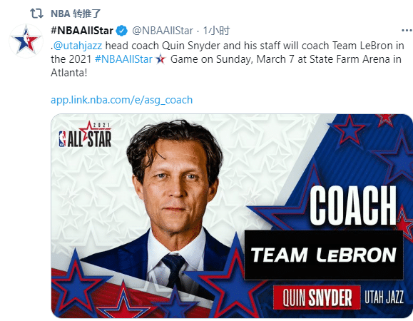 北京时间2月20日,NBA官方以及NBA全明星官推都正式宣布詹姆斯队的主教练,爵士主帅斯奈德出任西部全明星主教练并且执教詹姆斯队;杜兰特队主帅将在老里弗斯和纳什两人之中产生,很快就会有又结果了。
