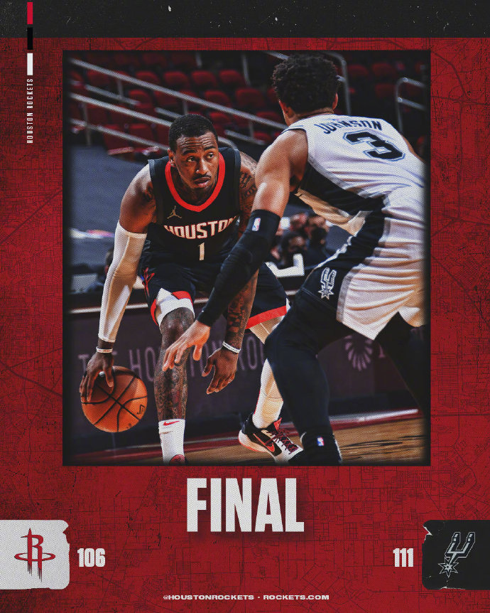24直播网讯:北京时间2月7日,2020-21赛季NBA常规赛继续进行,休斯顿火箭队在主场迎战圣安东尼奥马刺队。最终,马刺队以111-106战胜火箭队,取得连胜。
