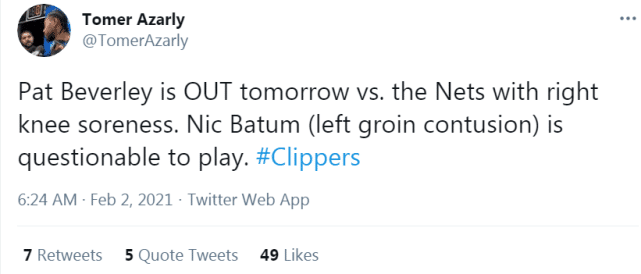 24直播网讯 北京时间2月3日上午8点30分,篮网和快船将打响焦点之战,赛前,两队的最新伤情已经出炉。篮网一方,三巨头都不在伤病名单上,他们可以再次联手出击,而快船一方,小卡和乔治可以上场,但他们可能会缺少两个重要的帮手。
