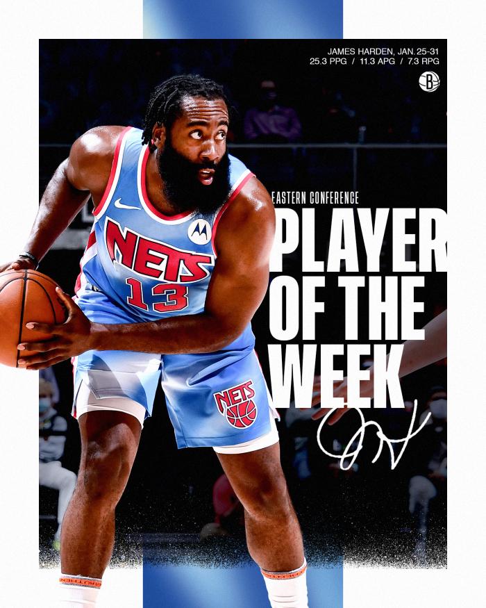 哈登已经为篮网出战8场比赛,期间篮网6胜2负杀到东部第二,场均24.5分11.1助攻6.4篮板,场均得分明显下降,但他为篮网组织进攻,众队友皆得益于他的助攻;篮网官方晒哈登集锦,并且写道:加盟篮网仅两周,便赢得东部周最佳。
