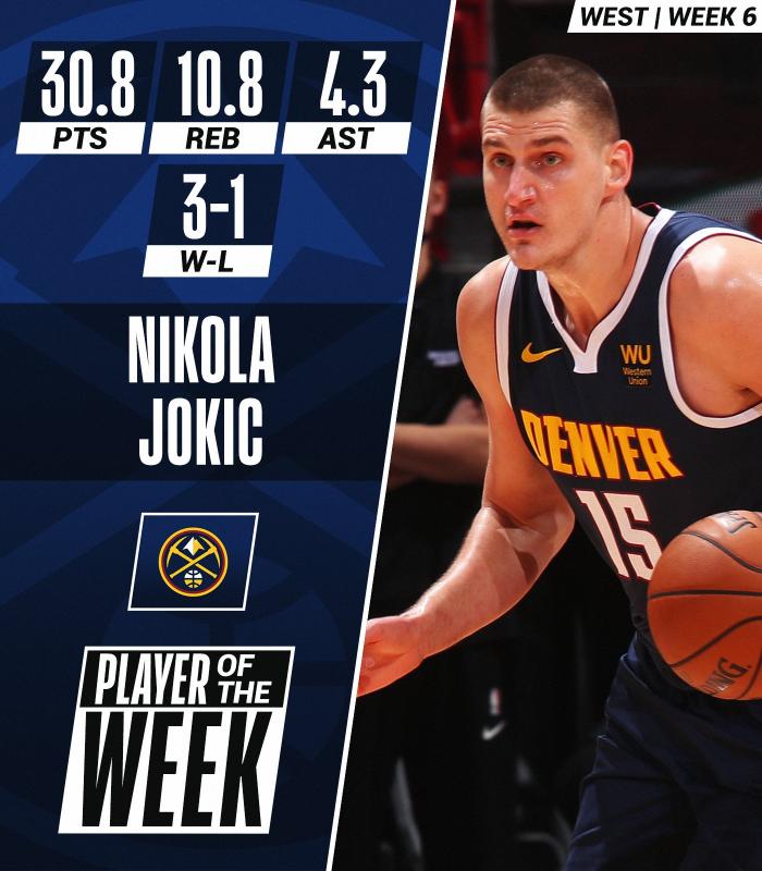 上周约基奇带领掘金拿到3胜1负,场均轰下30.8分10.8篮板4.3助攻,期间分别击败太阳、独行侠和热火以及输给马刺;目前掘金12胜4负排名西部第四名,约基奇不仅个人数据出色,而且球队战绩也不错,本赛季有希望冲击一下常规赛MVP。