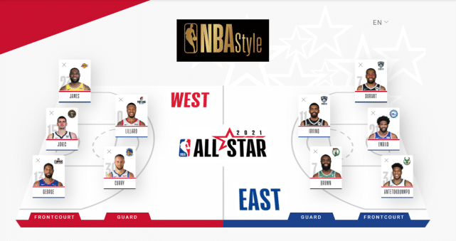 帕金斯选择的东部全明星首发阵容是:欧文、布朗、杜兰特、字母哥和恩比德;西部全明星首发阵容是:库里、利拉德、乔治、詹姆斯和约基奇。