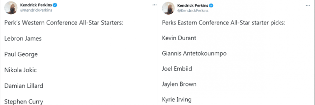 24直播网讯 北京时间1月29日,NBA全明星票选已经正式开启,各支球队都在为自己的球星造势拉票,而一些圈内人士也谈到了相关的话题。比如在社媒上很活跃的肯德里克-帕金斯,他在第一时间公布了自己的投票结果。