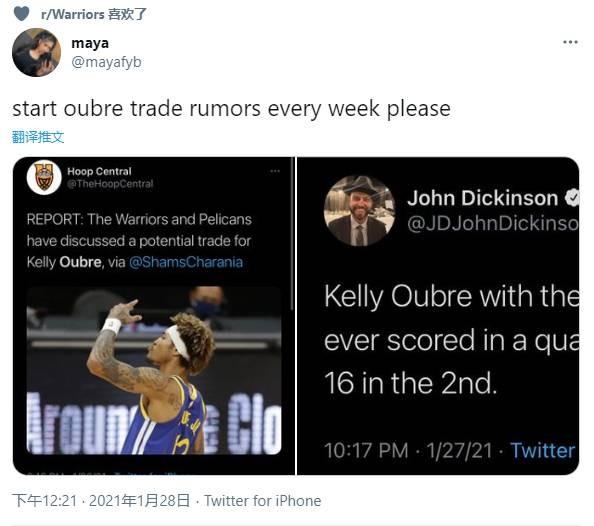 勇士媒体在比赛中晒出了网友的一个关于乌布雷交易和乌布雷爆发的截图对比,并调侃:“请每周来一遍乌布雷的交易流言,拜托了。”是啊,如果交易流言能让乌布雷每场都有这样的发挥,不介意多来几次,反而对球队有利!