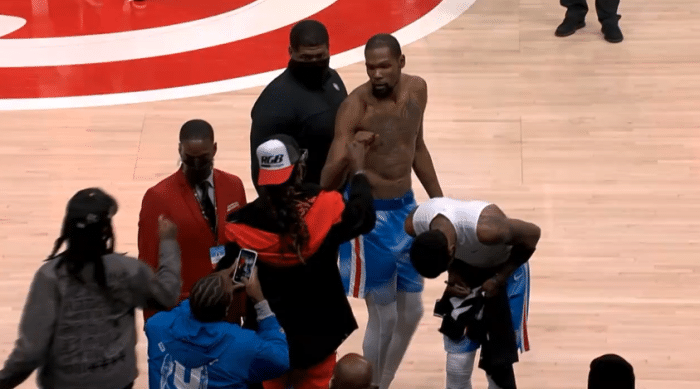 篮网赢球,哈登又打出全能一战,赛后杜兰特和欧文都把本场所穿的原味球衣脱掉并且签名送给现场的球迷(应该是杜欧的朋友),杜兰特直接赤膊半身光着膀子走回更衣室,这身材太抢镜了。