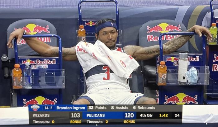 24直播网讯 北京时间1月28日,奇才又输了,106-124惨败鹈鹕18分,韦少缺席比赛,比尔苦战40分钟37投17中、三分14中6轰下47分6助攻4篮板4抢断,无奈比尔又沦为空砍帝,由于分差太大,比尔被迫提前放弃比赛,累得瘫坐替补席一脸无助的表情又火了。