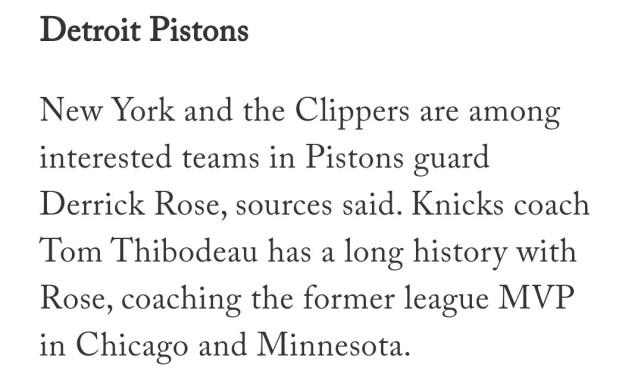 消息源透露,底特律活塞的后卫德里克-罗斯引起多支球队兴趣,尼克斯和快船在其中。尼克斯教练汤姆-锡伯杜曾在公牛和森林狼执教过这位昔日的MVP,两人有过很长的合作经历。赛季至今,罗斯场均14.8分2.2篮板4.6助攻。快船一直在寻求控卫位置的补强,此前,也有记者报道称快船对鹈鹕的球哥也有兴趣。