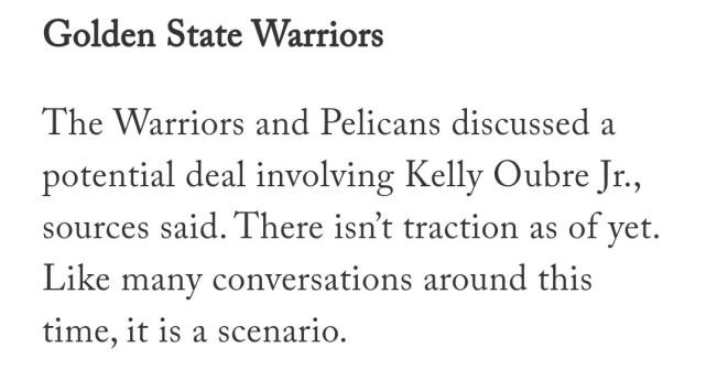 消息源透露,勇士和鹈鹕讨论过一笔涉及乌布雷的交易。目前还没有更多的进展,但查拉尼亚的报道至少说明了一点,勇士已经动了送走乌布雷的心思。再过10天,乌布雷就具备交易的资格,赛季至今,他的投篮表现难以令人满意,场均11.6分5.5篮板1.2助攻,投篮命中率35.5%,三分命中率21.8%,两项命中率都创生涯新低。