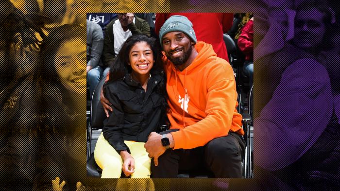 第一张照片是篮网在巴克莱中心球馆致敬科比的画面,8和24两个数字太刺眼,这代表科比曾穿过的8号和24号;第二张是科比和Gigi坐在篮网主场场边看比赛的合影。