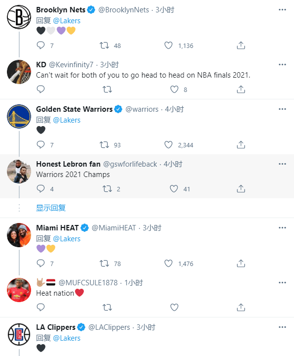 在湖人官推动态评论区,篮网、勇士、热火、快船、凯尔特人、独行侠、老鹰、掘金、国王、太阳、公牛、奇才、步行者、森林狼、费城数字大队、雷霆、魔术、猛龙、尼克斯以及爵士等队都发心形表情包,集体向科比致敬。