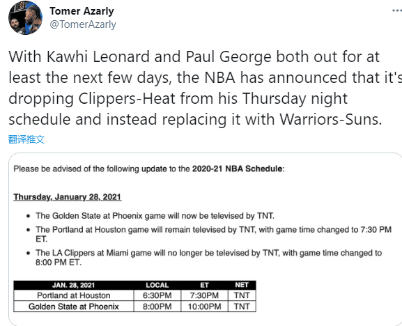 据名记Tomer Azarly报道,由于遵守防疫协议被隔离,小卡和乔治至少会缺席未来几天的比赛,因此NBA官方宣布更改赛程,快船和热火本周五TNT全美直播被取消,勇士和太阳的比赛成为当天的全美直播比赛。