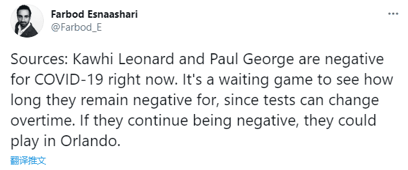 目前小卡和乔治两大球星没有随队出征客场,留在洛杉矶接受隔离;据快船记者Farbod Esnaashari报道,小卡和乔治目前的新冠检测为阴性,联盟仍在观察二人的检查情况,如果他们持续保持阴性,他们将可出战本周六快船与魔术的比赛。