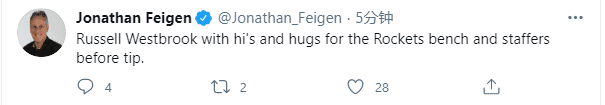 据火箭记者费根报道,赛前韦少走到火箭替补席,和火箭众球员以及工作人员打招呼并且拥抱。