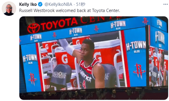 火箭在丰田中心球馆播放一段致敬韦少的视频,欢迎韦少重返丰田中心,播放韦少为休城社区做贡献的画面,视频以韦少身穿火箭0号战袍结尾,上面写着:谢谢你,拉塞尔-韦斯特布鲁克!