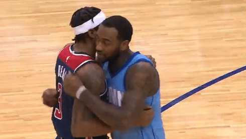 火箭和奇才赛前,沃尔和比尔先是用熟悉的庆祝手势互动,然后紧紧拥抱在一起;如今两兄弟已各自为主,沃尔身穿火箭1号战袍,与昔日好兄弟拥抱致意。