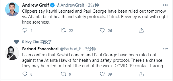 24直播网1月26日讯 快船队大麻烦来了,小卡和乔治两大巨星被隔离缺席比赛,据多位名记报道,小卡和乔治都因遵守联盟安全和健康防疫协议从而无法出战和老鹰的比赛,原因是小卡和乔治都触发新冠接触追踪机制,没有随队出征,快船记者Farbod Esnaashari更是预测乔卡可能被隔离到本周末。