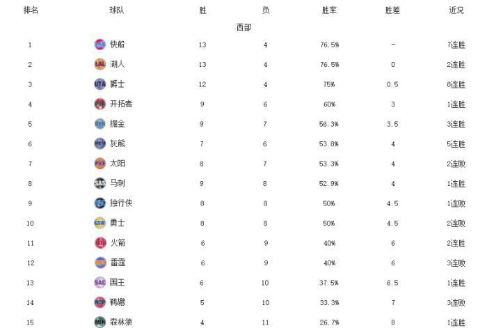 西部1-8名:快船、湖人、爵士、开拓者、掘金、灰熊、太阳、马刺;