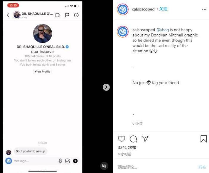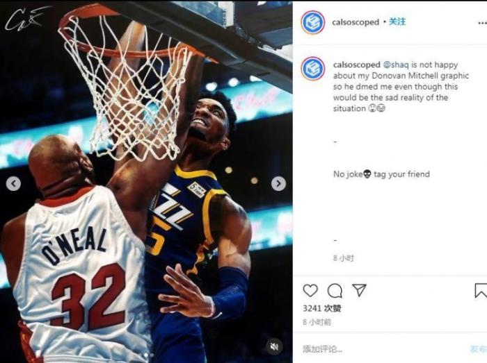 24直播网讯 北京时间1月25日,一位网友晒出了爵士球员米切尔隔扣奥尼尔的P图照,NBA传奇很不开心,大鲨鱼直接私信这位网友附文:闭上你的臭嘴!