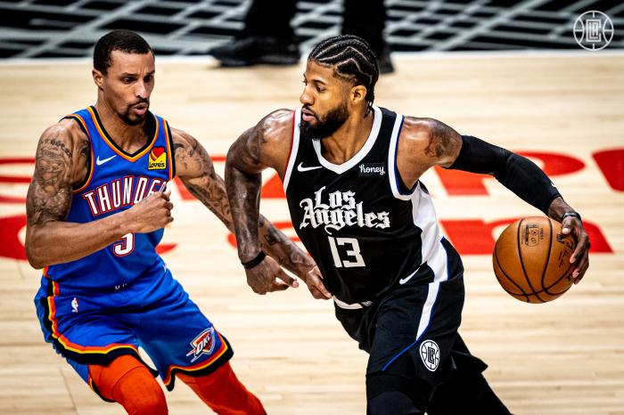 24直播网讯 北京时间1月25日,快船主场再次击败雷霆,喜提7连胜的同时又反超爵士和湖人从西部第三升到西部第一,小卡出战36分钟24投14中轰下34分9篮板8助攻,关键时刻一攻一防终结比赛,乔治状态低迷,全场出战33分钟13投4中、三分8中2拿到11分5篮板4助攻,最后4分多钟更是坐在替补席遭弃用。