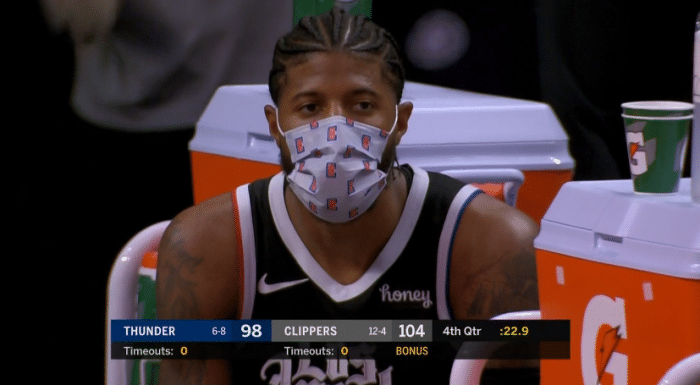 由于受到腿筋伤病的困扰(旧伤有点复发),乔治打得很挣扎。单场13分创赛季新低,比场均24.7分足足少了11.7分,最终4分31秒,乔治戴着口罩坐在替补席观战,很想上场却只能坐冷板凳;所幸小卡状态神勇扛起快船进攻大旗,最终带队拿下胜利又夺回西部第一,与此同时小卡单场30+8+8+0失误创纪录,成为快船队史近35年第一人。