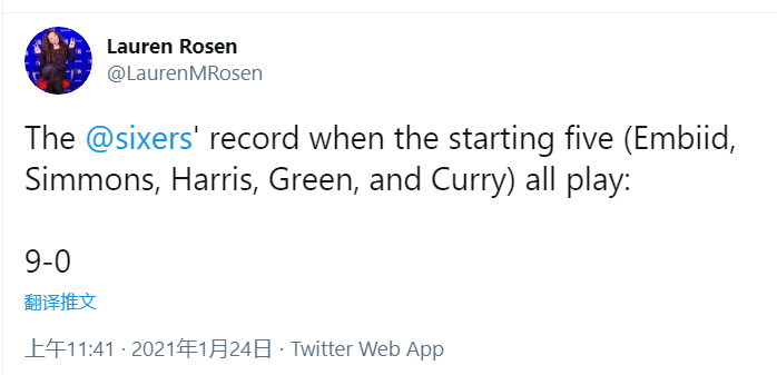 24直播网1月24日讯 NBA常规赛,费城114-110击败活塞,拿下3连胜继续排名东部第一,并且将与第二名的差距拉开到两个胜场。赛后,费城当地记者做出统计。本赛季,当费城先发五虎全部登场打球时,球队的战绩是疯狂的9胜0负。在里弗斯手下,费城本赛季非常有机会去创造佳绩。