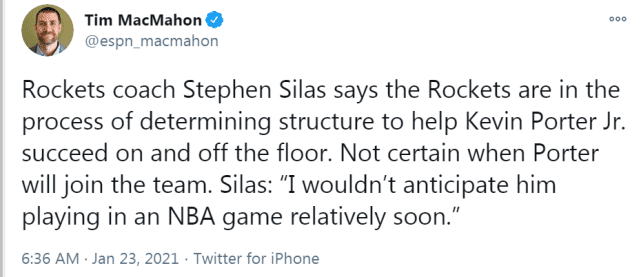 火箭和活塞这场比赛前,球队已经官宣了小波特的交易,不过,这位20岁的年轻人不会很快出现在火箭的比赛中。火箭目前正在对小波特的未来进行规划,期待帮助他同时获得场内和场外的成功。赛拉斯透露,他不确定小波特何时能加入球队。“我并未期待他很快出现在一场NBA比赛中。”休媒报道称,火箭官宣交易的前一天晚上,主教练赛拉斯、总经理斯通和助教卢卡斯已经和小波特有过交流。