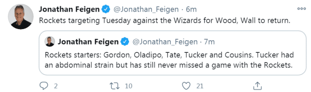 伍德和沃尔目前都在球队的伤病名单上,他们不会出战对活塞的比赛,也不会打接下来客场对独行侠的比赛。赛拉斯透露,沃尔和伍德的回归目标时间都是当地时间下周二对阵奇才的比赛。届时,火箭将迎来一个相对较完整的阵容。