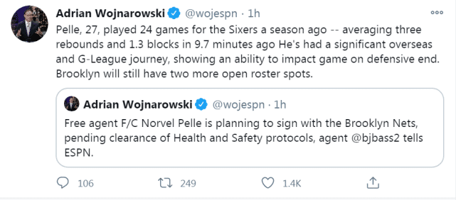 24直播网讯 北京时间1月23日,据ESPN记者沃纳罗斯基报道,篮网计划和27岁中锋诺威尔-佩莱签约。根据联盟的健康与安全协议,佩莱需要先通过规定的检测和隔离期,才能正式加盟球队。