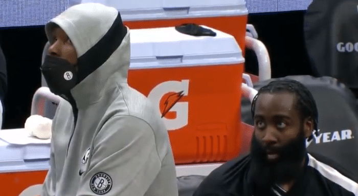 这样三巨头都在场边观看比赛,镜头给过去的时候,我们发现哈登在场边愣神,他并没有看比赛,则是在盯着地下有些发呆,这是哈登来到篮网之后第一次吃到连败,全场他只出手14次,命中6球,19分5板11助,没有了最开始两场比赛的意气风发。
