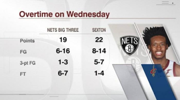 说塞克斯顿一人打爆篮网并不算错,因为加时赛的表现有如神助,球迷调侃“乔丹来了也得输”,没办法,他双加时一共得到了22分,而篮网三巨头加起来才19分。这位小将就此成为了詹欧后骑士第三位打出40+5+5+5个三分+50%命中率的第三人!