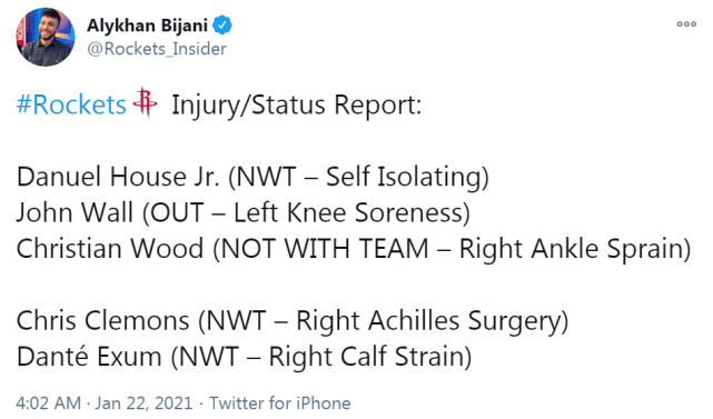 除了伍德,另外4位在火箭伤病名单上的球员是豪斯(自我隔离,并未随队)、沃尔(左膝酸痛,继续缺战)、克莱蒙斯(赛季报销,并未随队)、埃克萨姆(右小腿拉伤,并未随队)。
