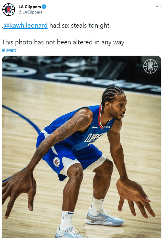 快船官微也特意P出了一张照片(下图),来称赞莱昂纳德的死亡缠绕。事实上,这不是莱昂纳德生涯第一次拿到30+6抢断的数据,16-17赛季在马刺以及18-19赛季在猛龙,莱昂纳德分别拿下过34分6断和31分6断的表现。这也是莱昂纳德生涯第5次单场抢断次数在6次或以上。他的生涯单场抢断之最是7次,出现在14-15赛季对阵勇士的比赛中。