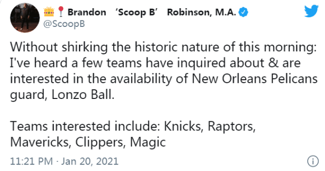 24直播网讯 北京时间1月21日,据NBA记者布兰登-罗宾逊报道,新奥尔良鹈鹕的控卫朗佐-波尔(球哥)引起了不少球队的兴趣,尼克斯、猛龙、独行侠、快船和魔术都已联系鹈鹕,询价球哥,探讨交易他的可能。