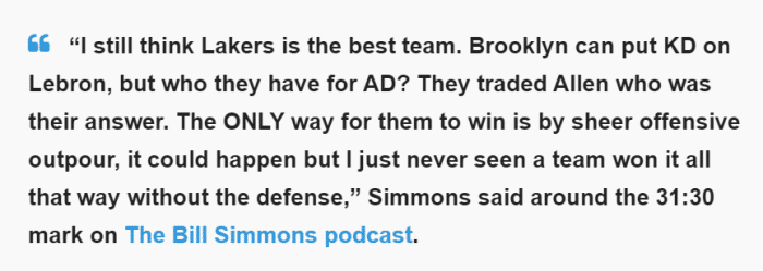 比尔-西蒙斯在最近一期的播客节目中说道:“我仍然认为湖人是最好的球队,布鲁克林可以用杜兰特去防詹姆斯,但他们有谁来限制戴维斯?贾内特-阿伦本该是他们的答案,但他被交易走了。篮网取胜的唯一方式是疯狂的进攻,这是有可能发生的,但我从来没见过一支球队能在没有防守的情况下夺冠。”