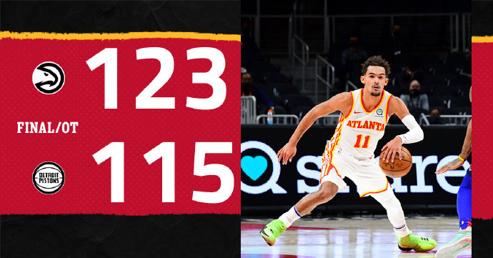 24直播网讯:北京时间1月21日,2020-21赛季NBA常规赛继续进行,亚特兰大老鹰队在主场迎战底特律活塞队。最终,老鹰队经过加时以123-115战胜活塞队。