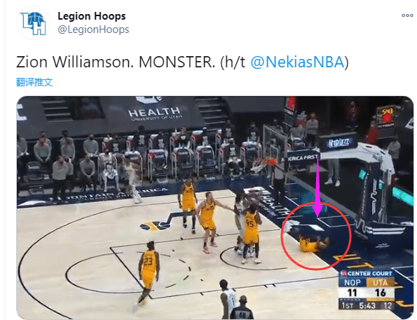 第一节5分多钟借助亚当斯的挡拆,锡安突然加速突破杀到禁区,高高跳起在空中撞倒爵士悍将费沃斯,费沃斯明显抵挡不住胖虎的冲击力,身体失去平衡直接摔倒在地板上;258斤锡安撞倒打爆费沃斯一幕引热议,美媒《SI》转发视频并且发推写道:锡安拥有不尊重人的力量。