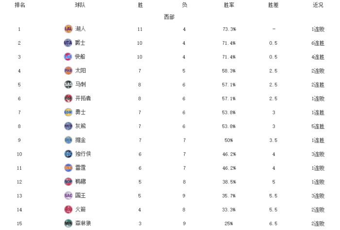西部9-15名:掘金、独行侠、雷霆、鹈鹕、国王、火箭、森林狼;