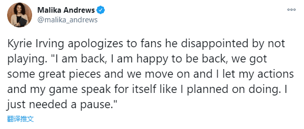 欧文向球迷道歉:我回来了,很高兴能够回归,我们得到了很好的球员,我们要向前看;我会按计划用行动和场上的表现来说话;我之前只是需要暂停一下。