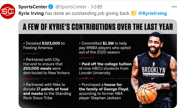 对于连续缺席7场比赛,欧文仅解释为处理家庭和个人事务,并没有透露更多事情,不过欧文在场外的举动引盛赞;美媒《Sports Center》列为欧文近一年的善举——想国家捐款32.3万美元,为纽约捐赠25万顿饭,捐款150万美元帮助WNBA球员,资助林肯大学的学生以及为乔治-弗洛伊德的家人买房。
