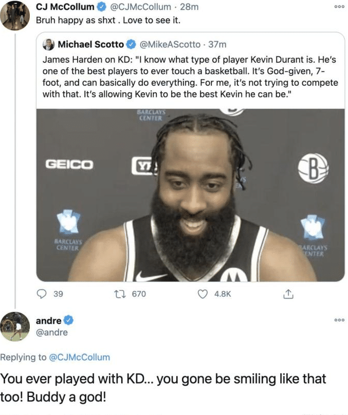 赛后的哈登一直笑,因为他得到了最好的夺冠机会,来到了最有天赋的球队之一!前勇士球员伊戈达拉调侃“如果你曾经和KD一起作战,你也会像这样笑起来!我兄弟杜兰特是个神!”CJ则回应“我之前从来没有和杜兰特一起并肩打过球,但是跟他一起训练过几次,我认为他真的就是一个作弊代码。”