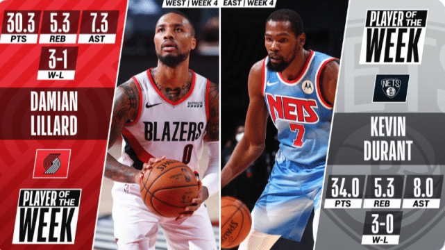 24直播网讯 北京时间1月19日,NBA官方公布了第四周的东西部最佳球员,篮网的凯文-杜兰特和开拓者的达米安-利拉德分别当选。上周,杜兰特帮助篮网取得3胜0负的战绩,利拉德帮助开拓者拿下3胜1负的战绩,独行侠的东契奇虽然有场均30+三双的爆发,但独行侠1胜2负,东契奇也无缘蝉联周最佳。