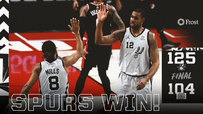 末节,攻击点更多的马刺逐渐拉开比分,米尔斯三分命中后,不仅让马刺的得分突破100分,而且将领先优势扩大到两位数,虽然利拉德连续得分,不过盖伊的连续三分让马刺始终保持两位数的领先,最多领先一度来到17分。开拓者也是在比赛还剩3分30秒时撤下主力,提前投子认负。最终马刺125-104击败开拓者迎来两连胜,