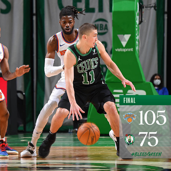 末节,双方拉锯了几个回合,斯马特和布朗联手3分,凯尔特人队以62-87落后。奎克利命中三分,布洛克也锦上添花,他们率队打出10-0的小高潮,第四节还有3分50秒时尼克斯队以101-64领先。大比分差距让比赛提前失去悬念,双方都尽遣替补,最终尼克斯队以105-75获胜。
