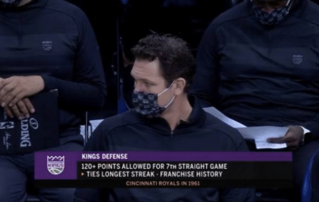 另外一组尴尬的数据则是,国王的丢分已经连续7场超过120分。从对阵勇士开始,国王先后丢分137分、124分、144分、125分、122分、132分和138分。根据统计,上一次国王出现连续7场丢分超过120分,还要追溯到1961年,当时国王甚至还不在萨克拉门托,也不叫国王,而是叫辛辛那提皇家队。