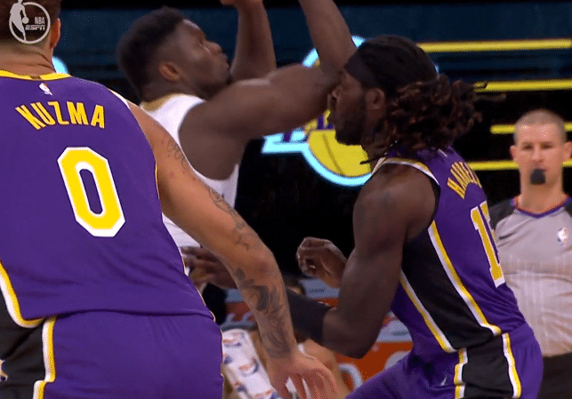 第二节开场没多久,大莫里斯在防守中惨遭锡安铁肘,大莫里斯被肘击到腹部,随后只见大莫痛苦倒地不起,抱着肚子十分痛苦,詹姆斯、马修斯和哈雷尔都过来,所幸大莫里斯也无大碍,暂停回来大莫继留在场上;锡安铁肘险些打伤湖人两大悍将,尤其是第二次,锡安铁肘开路太狠,大莫捂着肚子太痛苦。