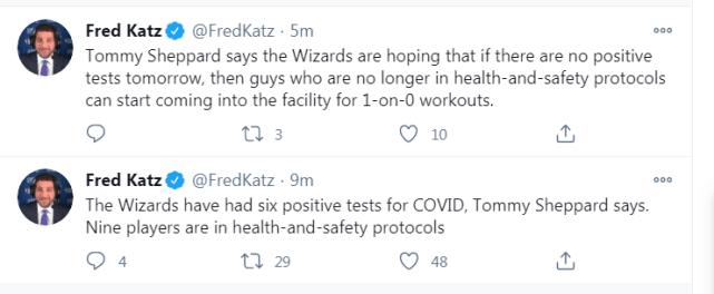 目前奇才队下周一、周二奇才对阵骑士的两场比赛将延期。奇才总经理汤米-谢泼德接受了采访,谈及队内爆发的新冠传播疫情。队内目前有9人处于新冠防疫机制之中,其中6人新冠检测结果呈阳性。球队已经关闭训练馆,就算可以训练,目前也只有6名球员能够参加。球队在通过Zoom组织球员进行居家线上训练。