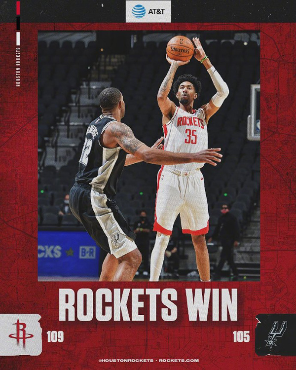 24直播网讯:北京时间1月15日,2020-21赛季NBA常规赛继续进行,休斯顿火箭客场挑战圣安东尼奥马刺。全场打完,火箭109-105逆转马刺,止住两连败。