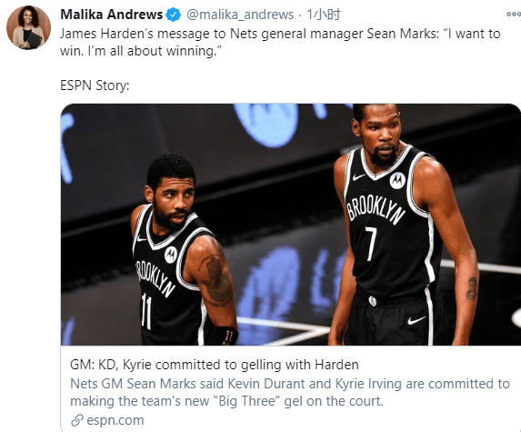 哈登已经正式加盟篮网,可欧文还没归队?肖恩-马克思表示哈登的交易与欧文缺席没有直接关系,欧文对重返赛场很兴奋,不过欧文还是能归队还要取决于联盟调查。