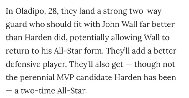 《休斯顿纪事报》记者费根指出,奥拉迪波是一个功守俱佳的后卫,比起哈登,他更适合与沃尔搭档,更有可能让沃尔回归全明星状态。比起哈登,他也是一个更好的防守者。