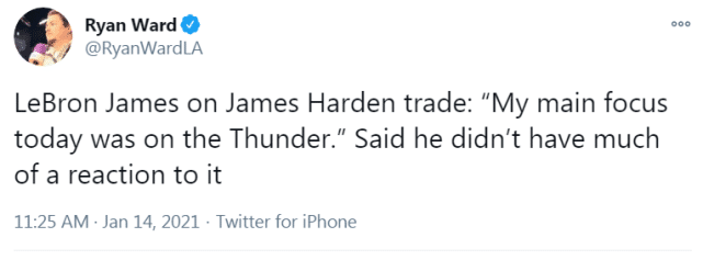 “我今天的主要注意力都放在雷霆身上,”詹姆斯回答道。他还表示自己对这笔交易没什么反应。哈登在一笔四方大交易中被交易到篮网,篮网因此组成了欧文、杜兰特、哈登三巨头的豪阵。篮网的夺冠赔率升至第二,仅次于排名第一的湖人。